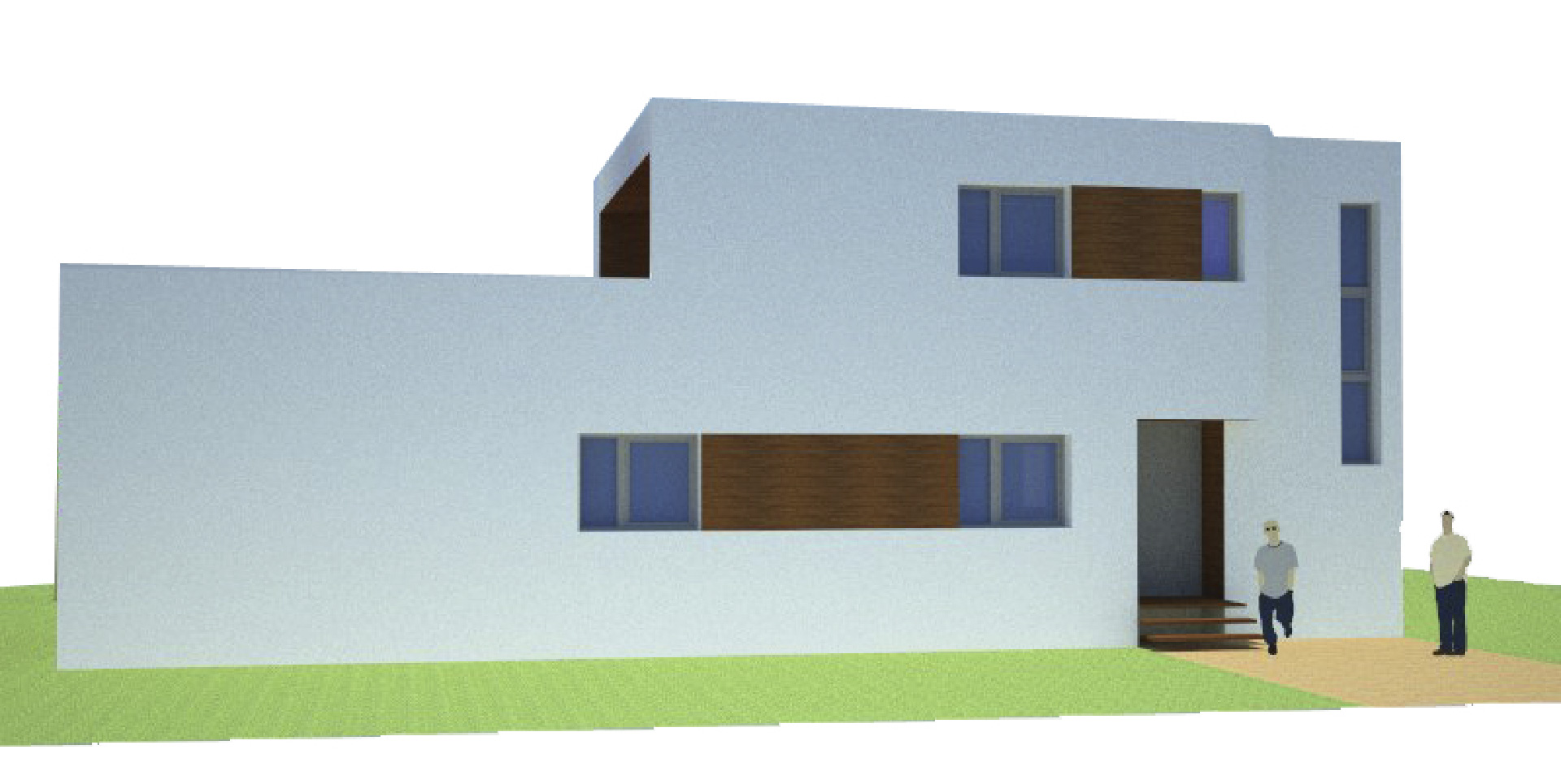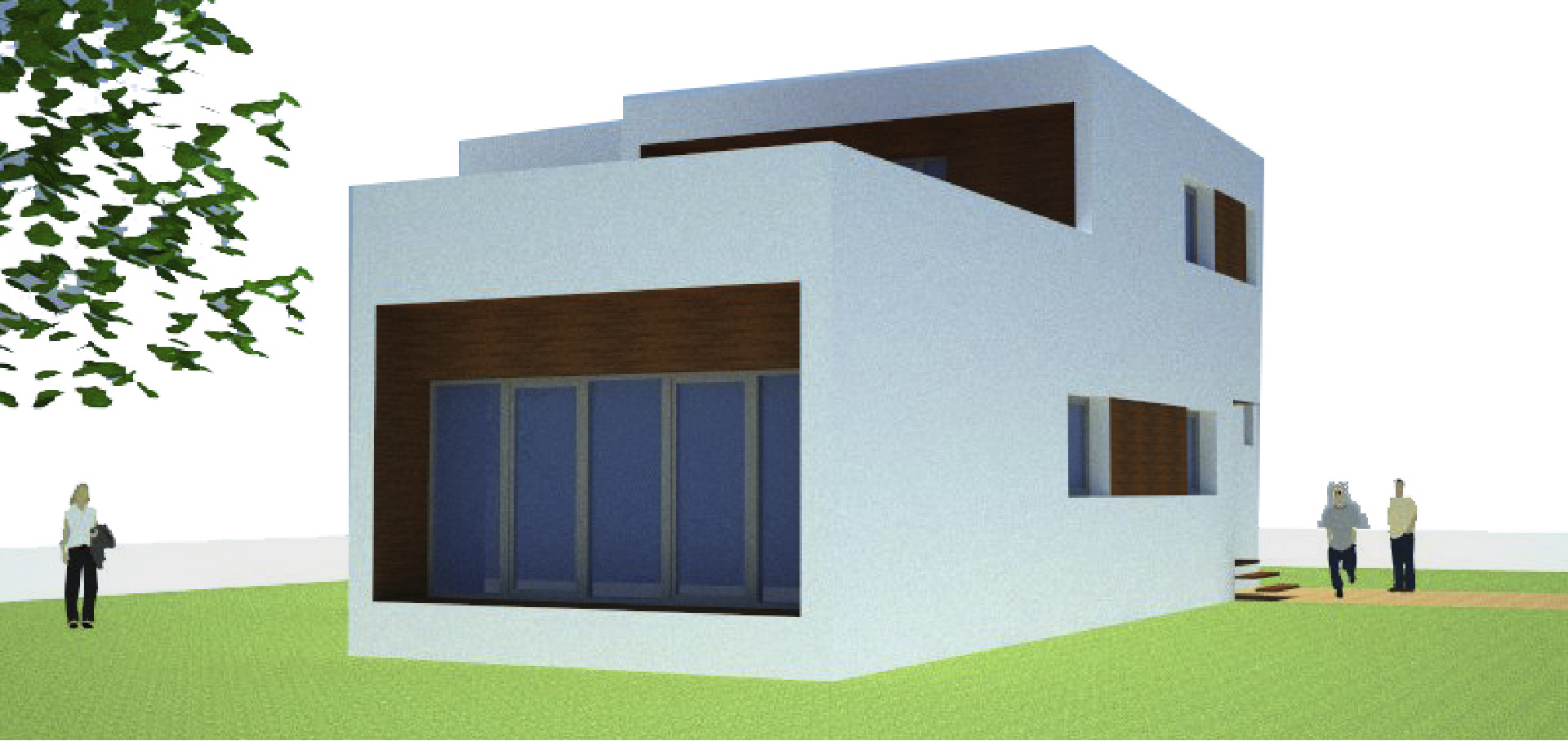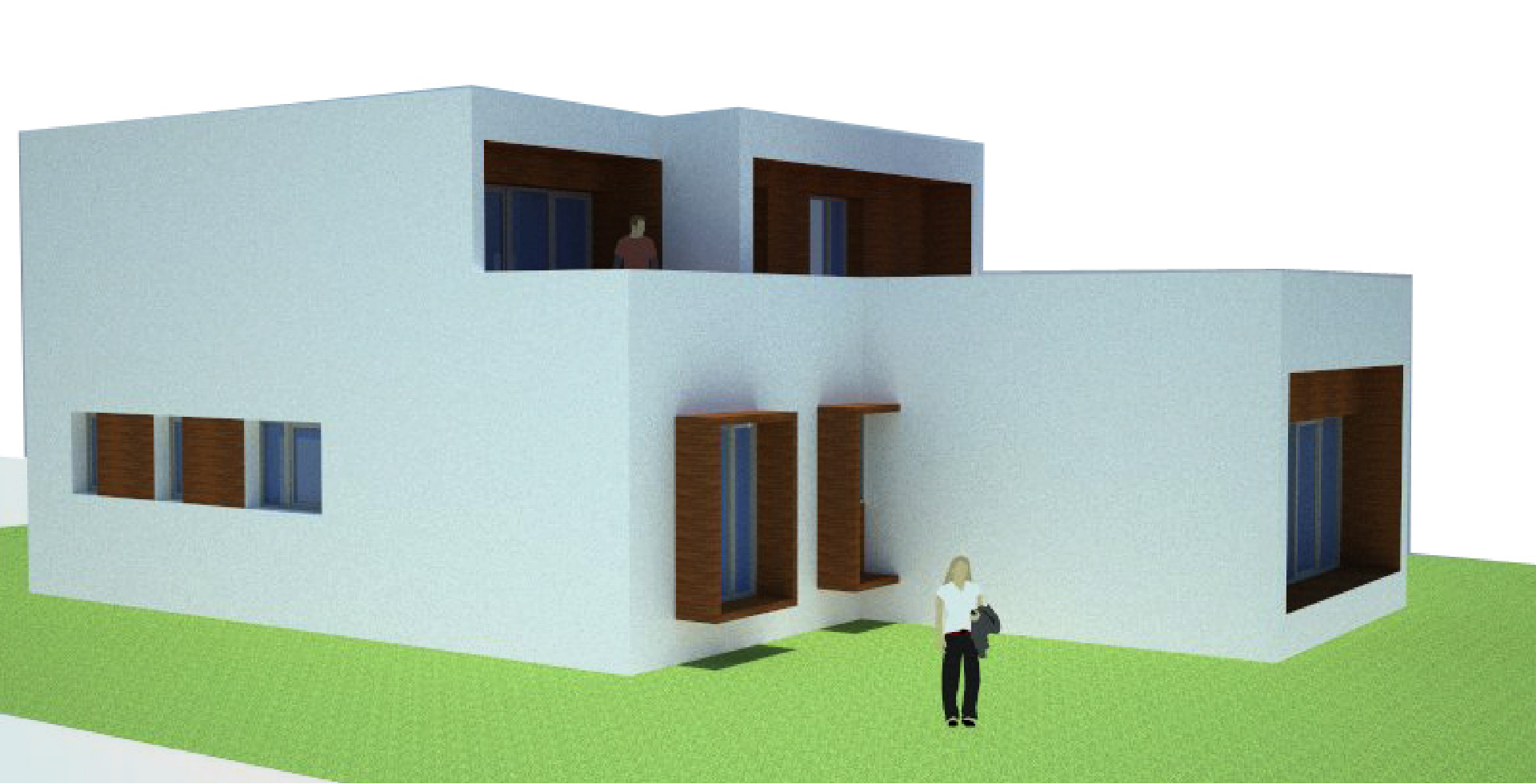La vivienda, de dos plantas, presenta una geometría clara, con un volumen racional en forma de paralelepípedo. No obstante, las esquinas de los paramentos verticales, tanto exteriores como interiores se redondearán, buscando la “forma orgánica”