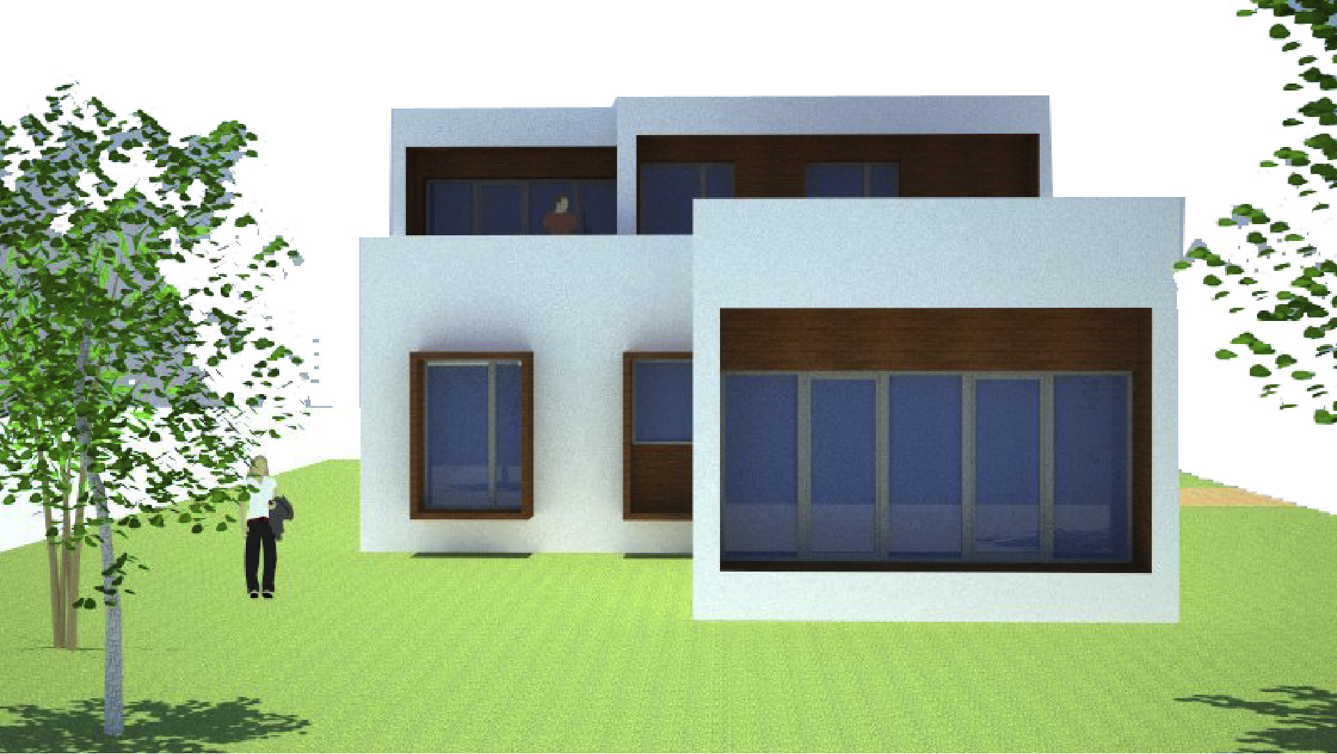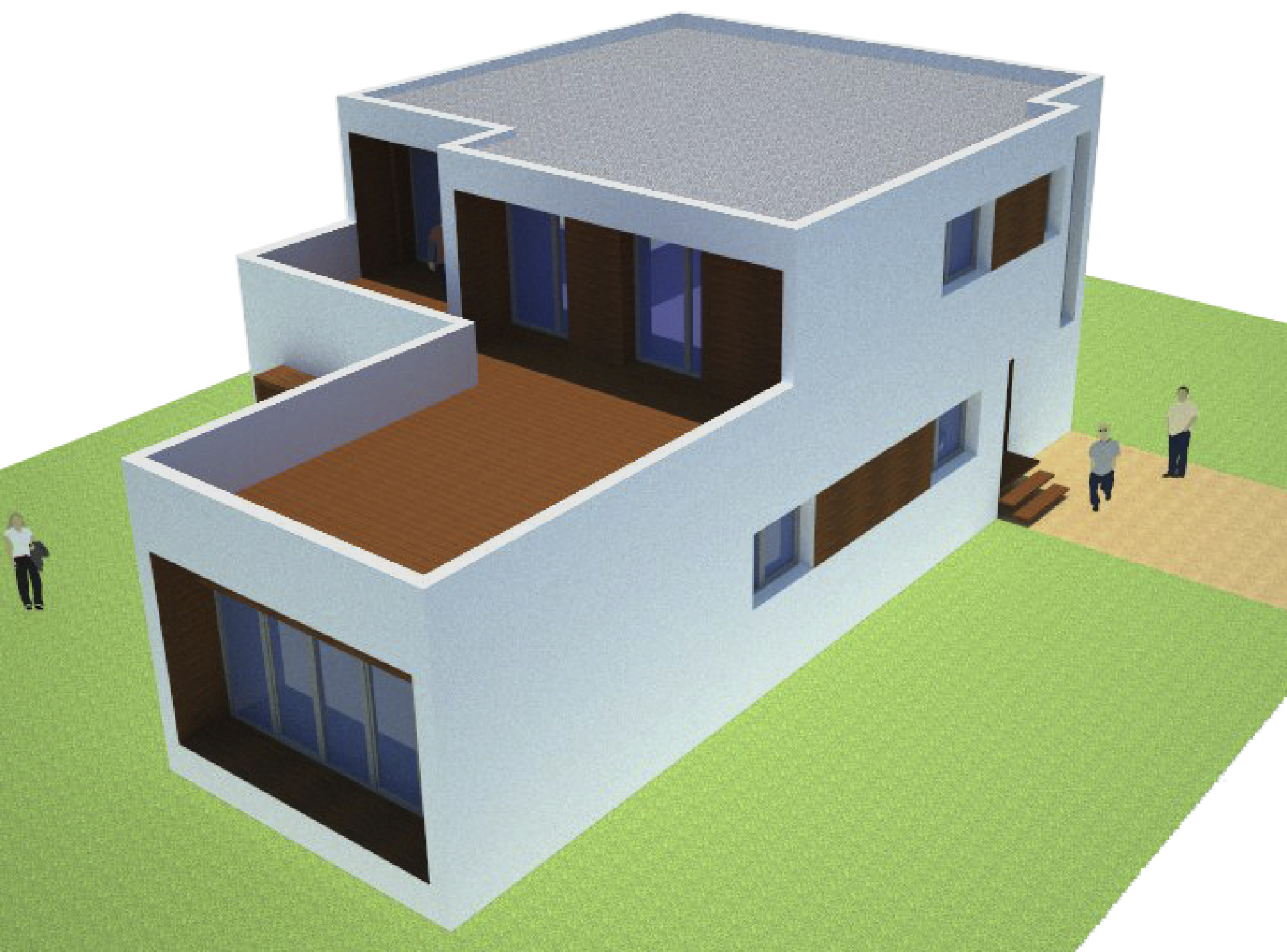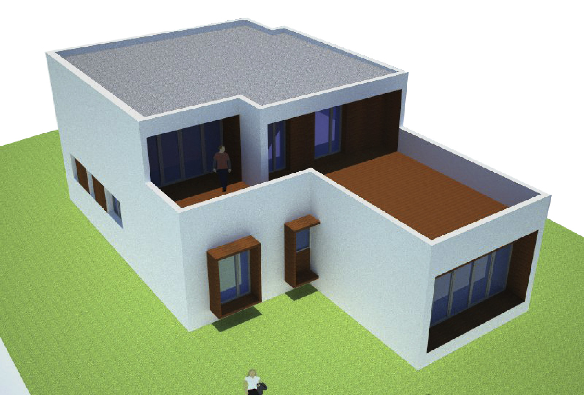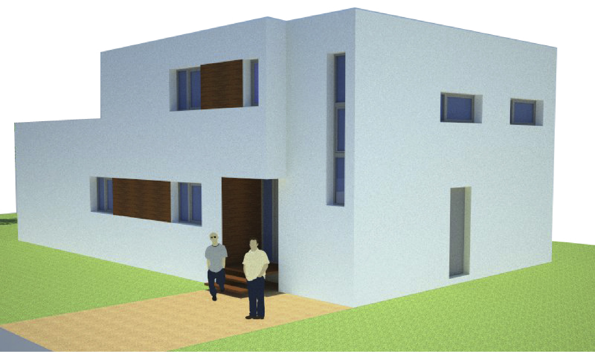 La vivienda, de dos plantas, presenta una geometría clara, con un volumen racional en forma de paralelepípedo. No obstante, las esquinas de los paramentos verticales, tanto exteriores como interiores se redondearán, buscando la “forma orgánica”